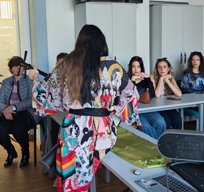 This was an equally rewarding experience for both the high school students who were introduced to Japanese language and culture, and for our students who got to share their passion for Japan and all things Japanese. Besides the language workshop, the WUT students played the shamisen and showed the 9th graders what a traditional shodō calligraphy set contains and how to use it.